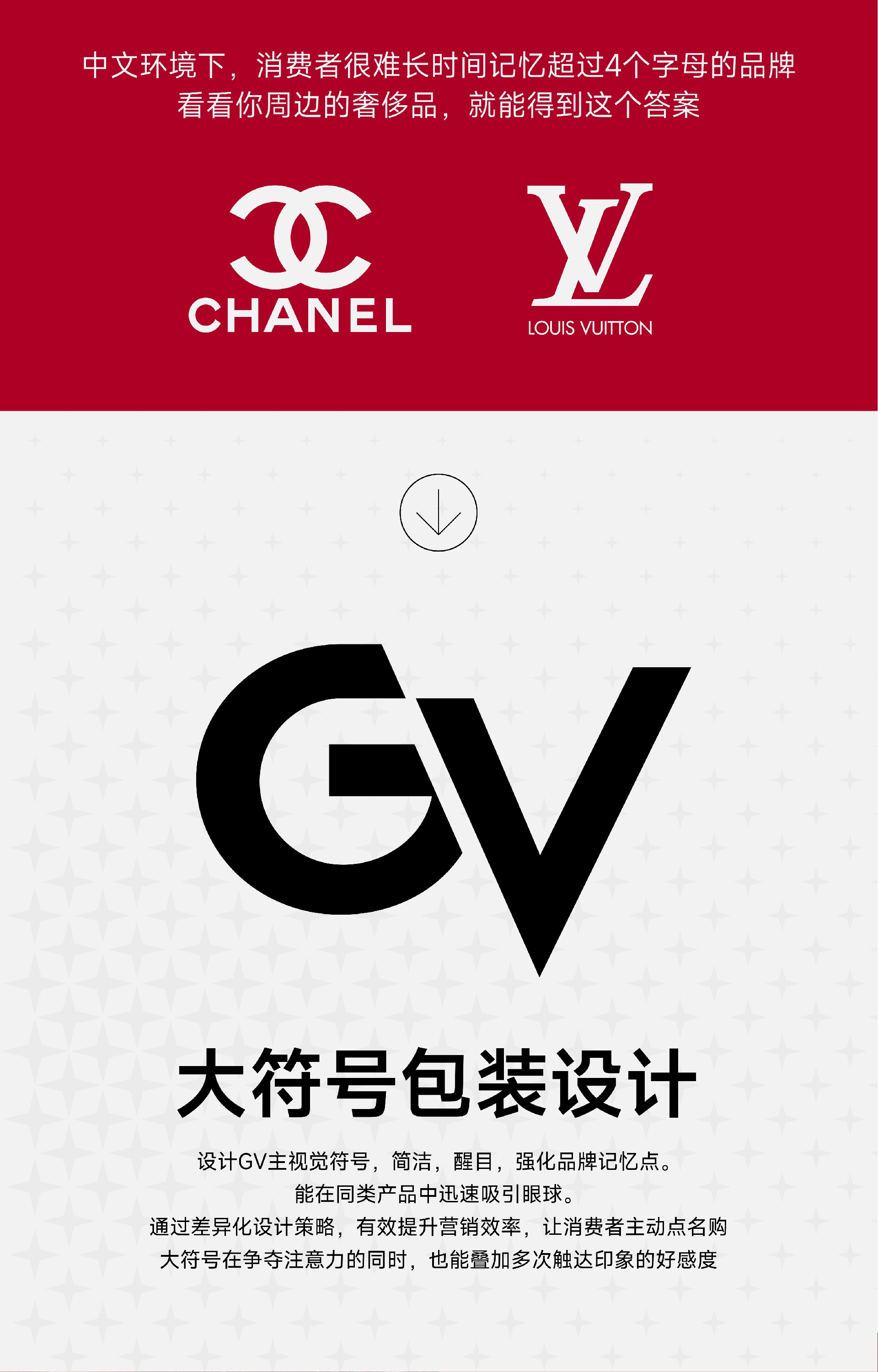 01 产品定位:核心痛点:肌肤松弛×营养失衡×久坐僵硬×小腹赘肉;目标人群:20-35岁职场女性、新锐妈妈、健身轻食族;竞品短板:配方同质化(仅含基础维生素)、人工香精残留(口感廉价)。中文环境下消费者很难长时间记忆超过4个字母的品牌看看你周边的奢侈品,就能得到这个答案。大符号包装设计——设计GV主视觉符号,简洁,醒目,强化品牌记忆点。能在同类产品中迅速吸引眼球通过差异化设计策略,有效提升营销效率,让消费者主动点名购大符号在争夺注意力的同时,也能叠加多次触达印象的好感度
