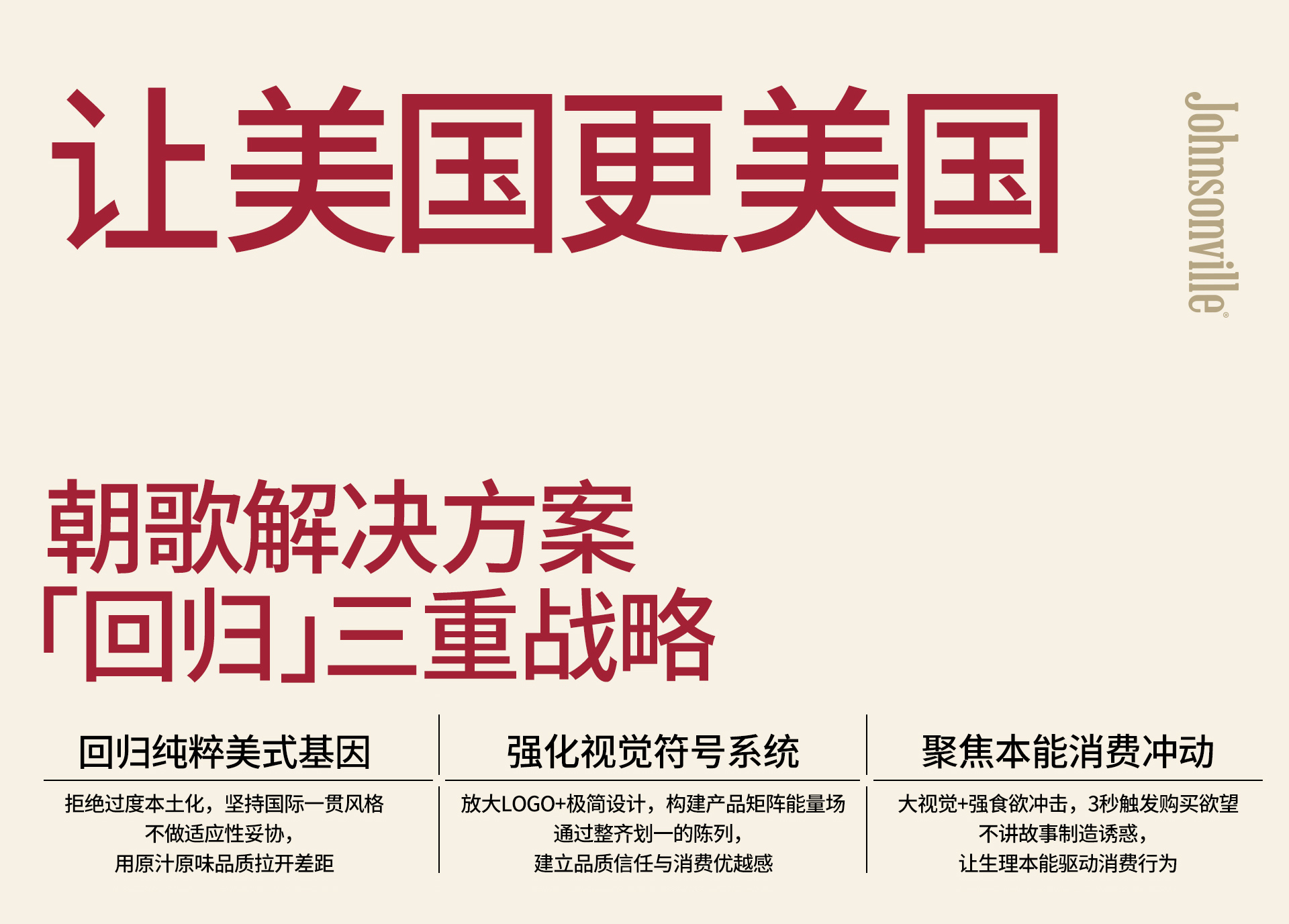 朝歌解决方案:「回归」三重战略 1️⃣ 回归纯粹美式基因拒绝过度本土化,坚持国际一贯风格,不做适应性妥协,用原汁原味品质拉开差距; 2️⃣ 强化视觉符号系统,放大Logo+极简设计,构建产品矩阵能量场,通过整齐划一的陈列,建立品质信任与消费优越感; 3️⃣ 聚焦本能消费冲动,大视觉+强食欲冲击,3秒触发购买欲望,不讲故事只造诱惑,让生理本能驱动消费行为