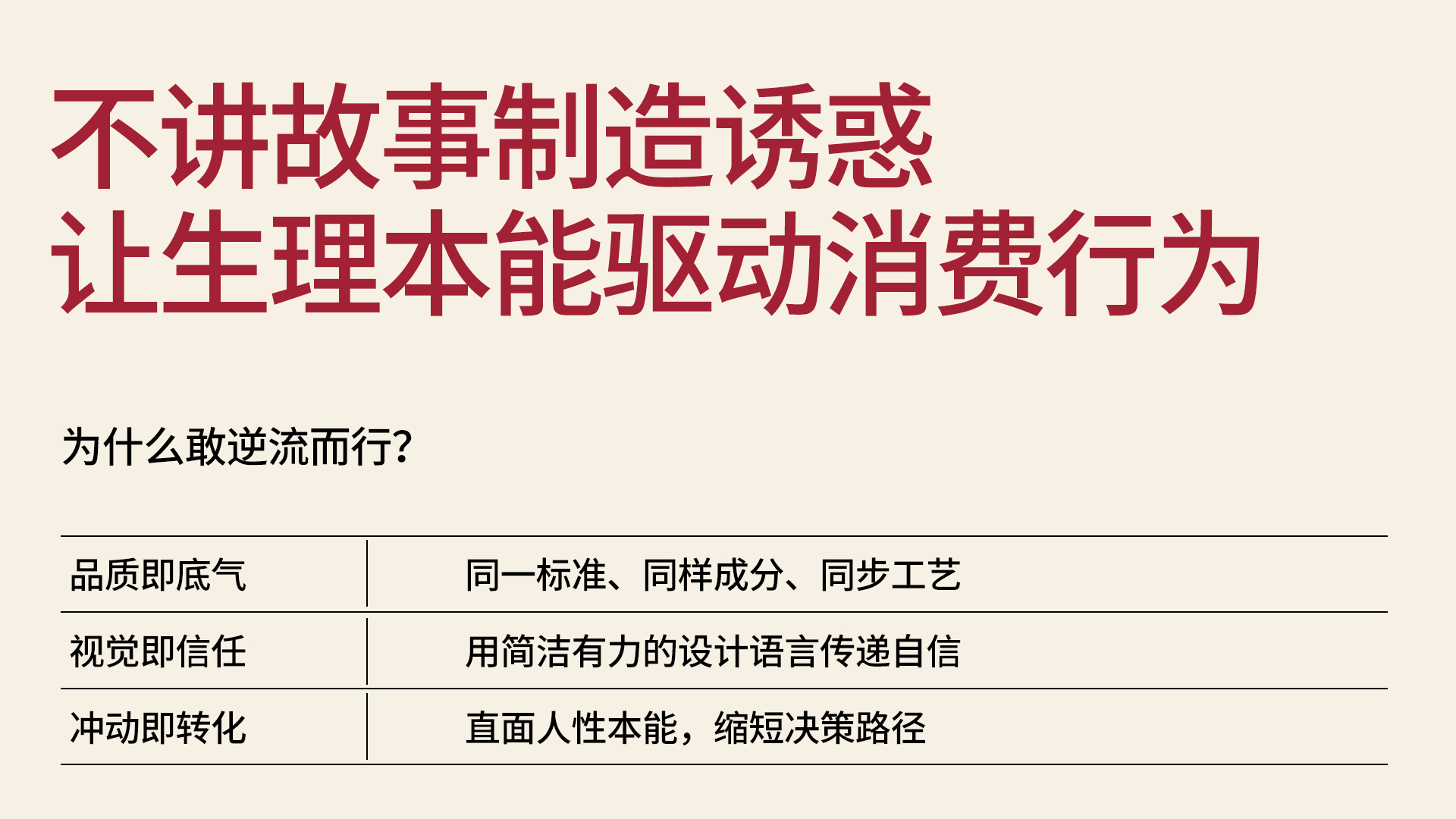 为什么敢逆流而行?品质即底气:同一标准、同样成分、同步工艺;视觉即信任:用简洁有力的设计语言传递自信;冲动即转化:直面人性本能,缩短决策路径。内卷时代,我们选择用「回归」打破困局——回归品质初心,回归视觉本质,回归人性需求!